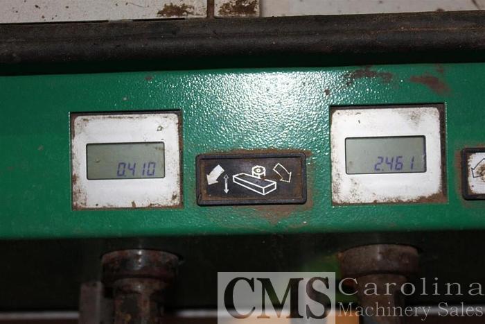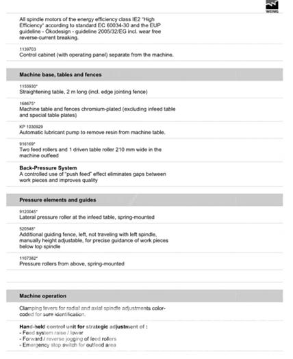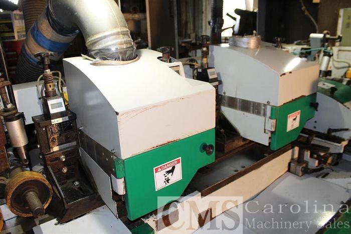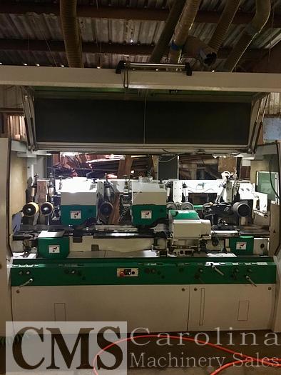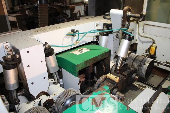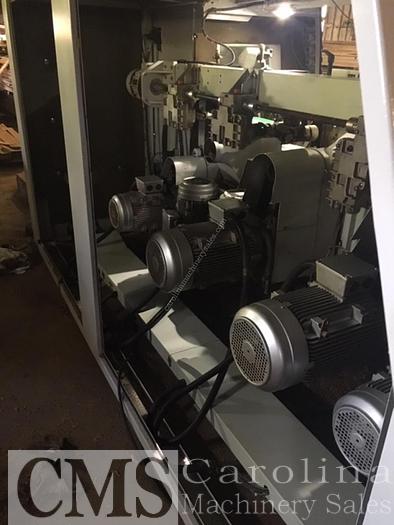 This machine was owned in a small shop that closed down. Manufacturer Specs (to be confirmed) Working cap. 9-1/16" x 4-3/4” Motors B-10 HP, R-10 HP, L-10 HP, T-20 HP, T-20 HP and B-10 HP. Electronic brakes. Spindles Dia. 1-1/2” at 6,000 RPM. LED readouts all spindles. CNC WEINIG "EZY COM" LED readouts including chipbreaker’s and holddown’s. Radial adjustment of spindles 3, 4 and 5. Modem for external diagnostics. Feed Variable speed drive with 5.5 HP motor; with speeds from 18-98 FPM. Short stock attachment. Axial adjust of feed roller opposite left spindle 1.36". Infeed/Tables 2M (6’6”) infeed table with side pressure roller before first bottom spindle; Chromed tables and fences Auto table lubrication pump. (2) powered table rollers between top spindles and at outfeed.